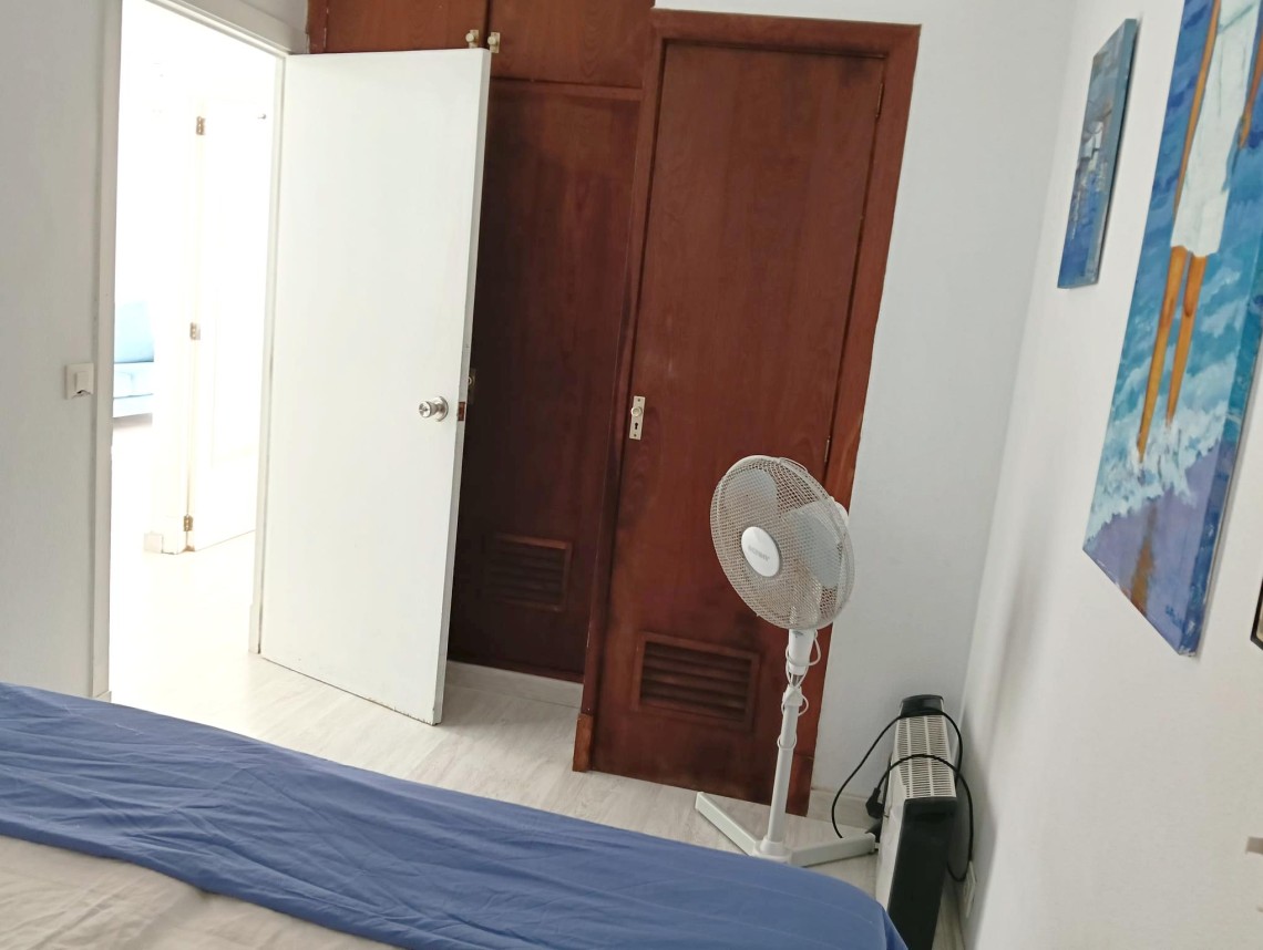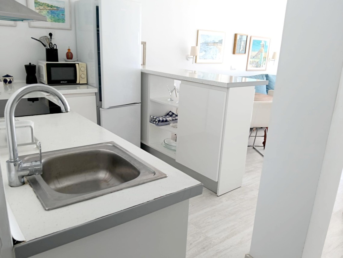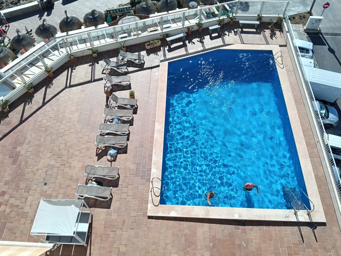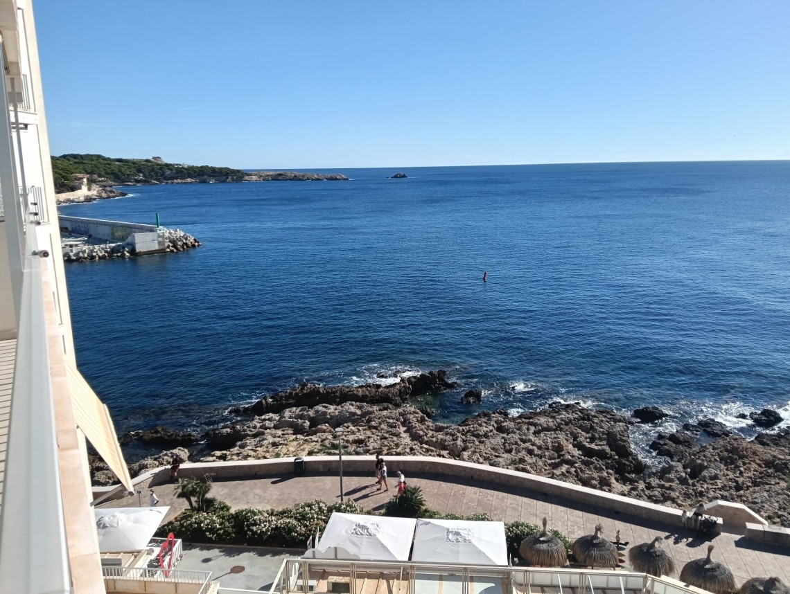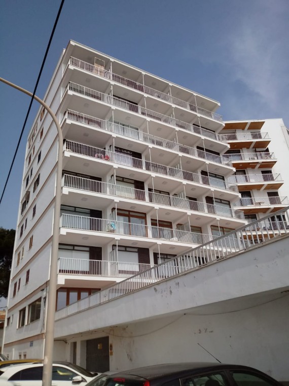 Denna ljusa och trevliga lägenhet ligger på femte våningen med hiss och bjuder på en fantastisk utsikt över det glittrande havet. Med en total yta på 66 m² erbjuder den ett välplanerat boende med kök, vardagsrum, två sovrum och ett badrum – perfekt för dig som vill njuta av Mallorcas kustliv.