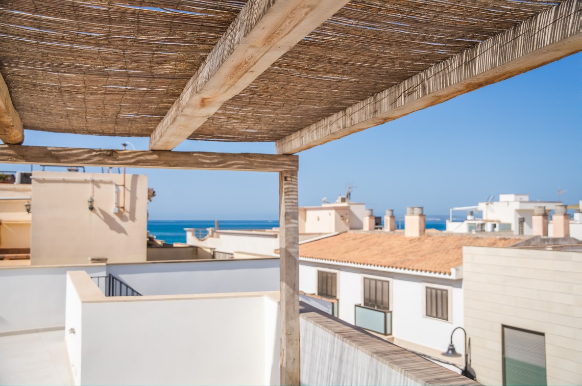 Takterrass: En utvändig trappa ger tillgång till takterrassen, där du kan njuta av panoramautsikt över havet och ett rymligt område för utemöbler, skyddat av en pergola.