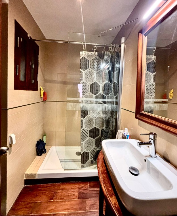Lägenheten har ett dubbelrum med skräddarsydda garderober och tillgång till en privat balkong, där du kan njuta av ett intimt och ljust utrymme. Vardagsrummet, som också är rymligt och bekvämt, har direkt utgång till balkongen, vilket släpper in naturligt ljus.